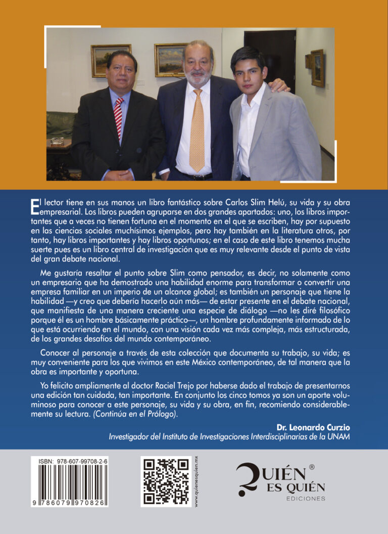 El lector tiene en sus manos un libro fantástico sobre Carlos Slim Helú, su vida y su obra -empresarial. Los libros pueden agruparse en dos grandes apartados: uno, los libros importantes que a veces no tienen fortuna en el momento en el que se escriben, hay por supuesto en las ciencias sociales muchísimos ejemplos, pero hay también en la literatura otros, por tanto, hay libros importantes y hay libros oportunos; en el caso de este libro tenemos mucha suerte pues es un libro central de investigación que es muy relevante desde el punto de vista del gran debate nacional.