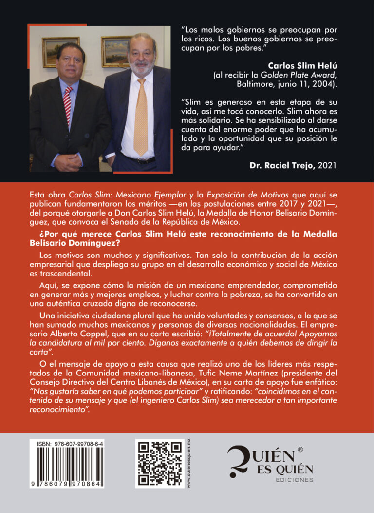 Esta obra Carlos Slim: Mexicano Ejemplar y la Exposición de Motivos que aquí se publican fundamentaron los méritos -en las postulaciones entre 2017 y 2021-, del porqué otorgarle a Don Carlos Slim Helú, la Medalla de Honor Belisario Domin-guez, que convoca el Senado de la República de México.