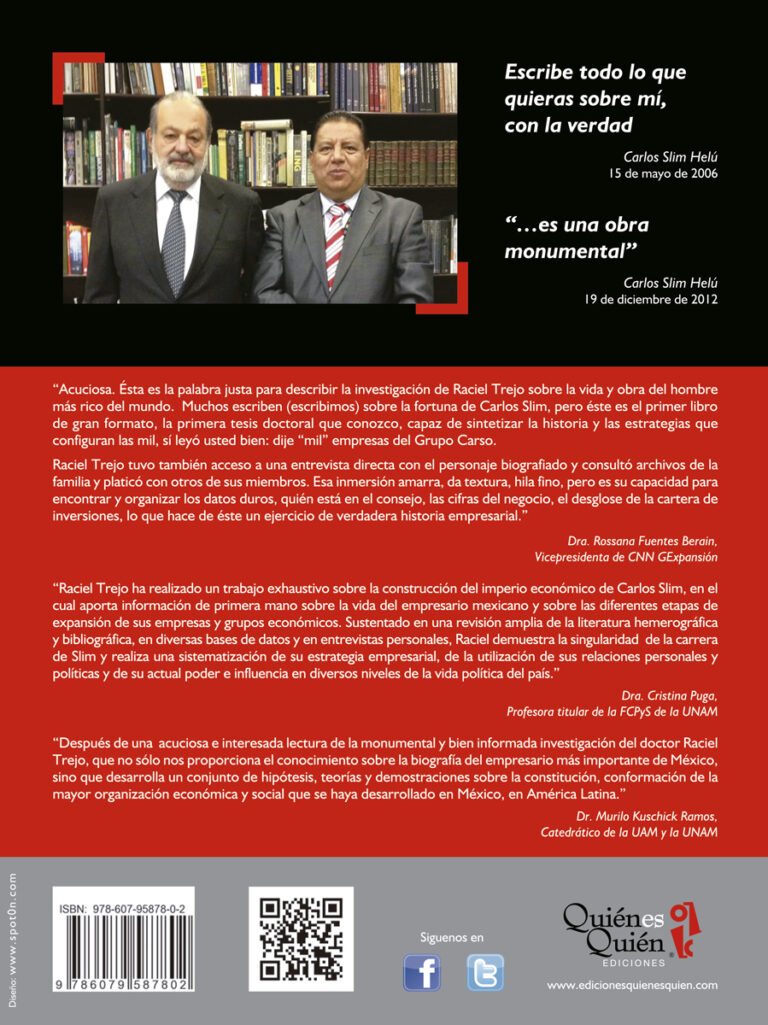 “Raciel Trejo ha realizado un trabajo exhaustivo sobre la construcción del imperio económico de Carlos Slim, en el cual aporta información de primera mano sobre la vida del empresario mexicano y sobre las diferentes etapas de expansión de sus empresas y grupos económicos. Sustentado en una revisión amplia de la literatura hemerográfica y bibliográfica, en diversas bases de datos y en entrevistas personales, Raciel demuestra la singularidad de la carrera de Slim y realiza una sistematización de su estrategia empresarial, de la utilización de sus relaciones personales y políticas y de su actual poder e influencia en diversos niveles de la vida política del país.”